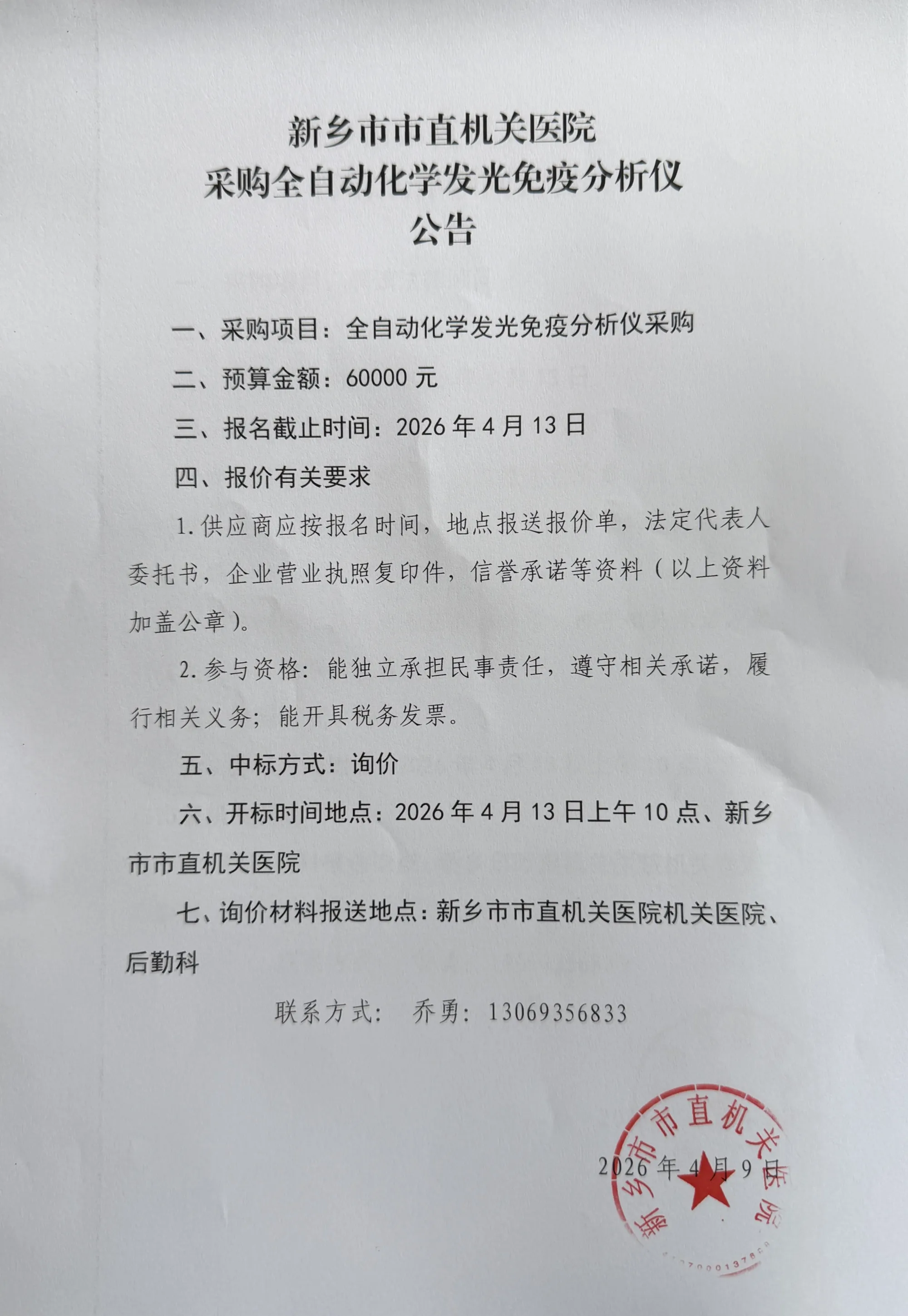 新乡市市直机关医院 采购全自动化学发光免疫分析仪 公告