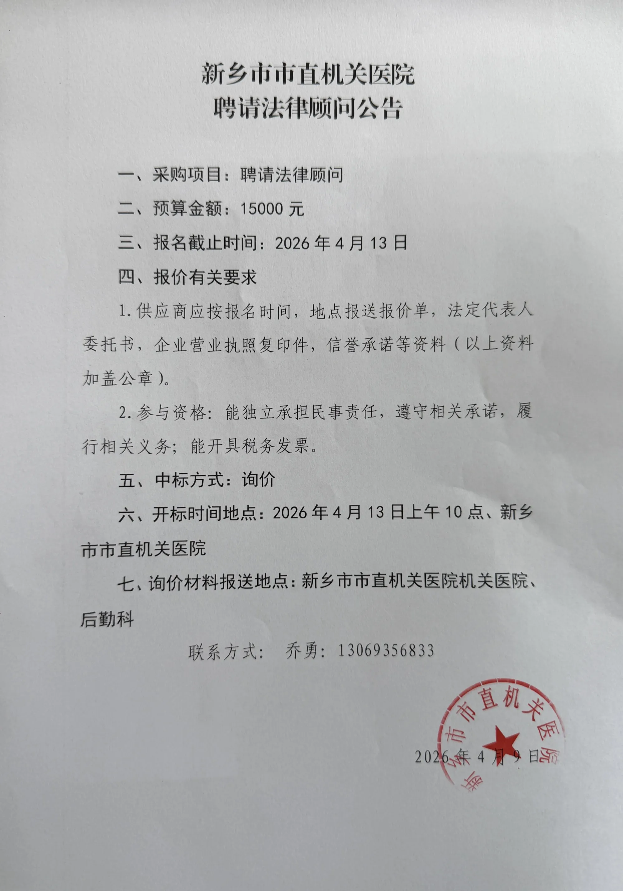新乡市市直机关医院 聘请法律顾问 公告