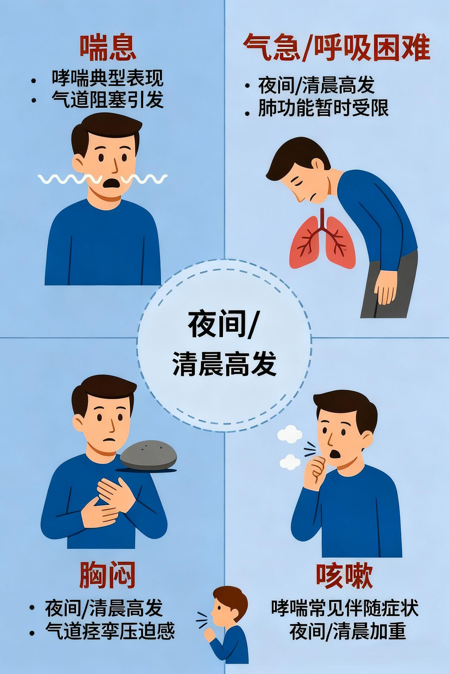 哮喘病人主要症状是发作性的气喘、胸闷、咳嗽,通常与接触某些诱因有关,例如尘螨、宠物皮毛、花粉、油漆、油烟、汽车尾气、食物及药物等,感冒、气候变化也是常见的诱发和加重因素。少见的哮喘类型有咳嗽变异性哮喘、胸闷变异性哮喘、运动型哮喘等,部分患者仅表现为夜间憋醒。