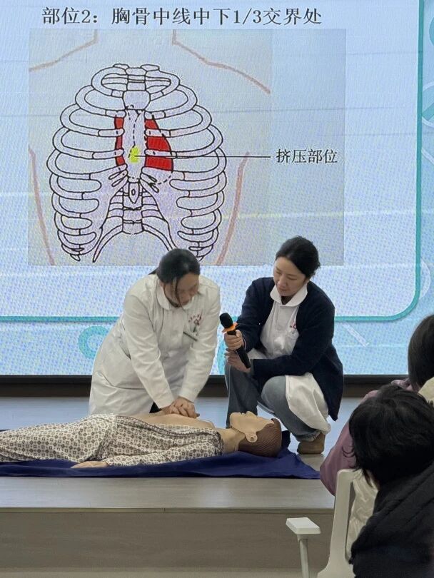 理论环节,中心急救科普服务队的医护人员结合真实案例,系统拆解了心脏骤停、异物梗阻的应急处置流程:从如何快速判断患者意识与呼吸,到规范拨打120急救电话的关键要点;从心肺复苏时“两乳头连线中点”的按压位置,到按压深度、频率的科学标准;从成人海姆立克法的腹部冲击技巧,到婴幼儿异物梗阻的背部拍击要领,用通俗语言破解常见急救误区,让家长们清晰掌握操作核心。