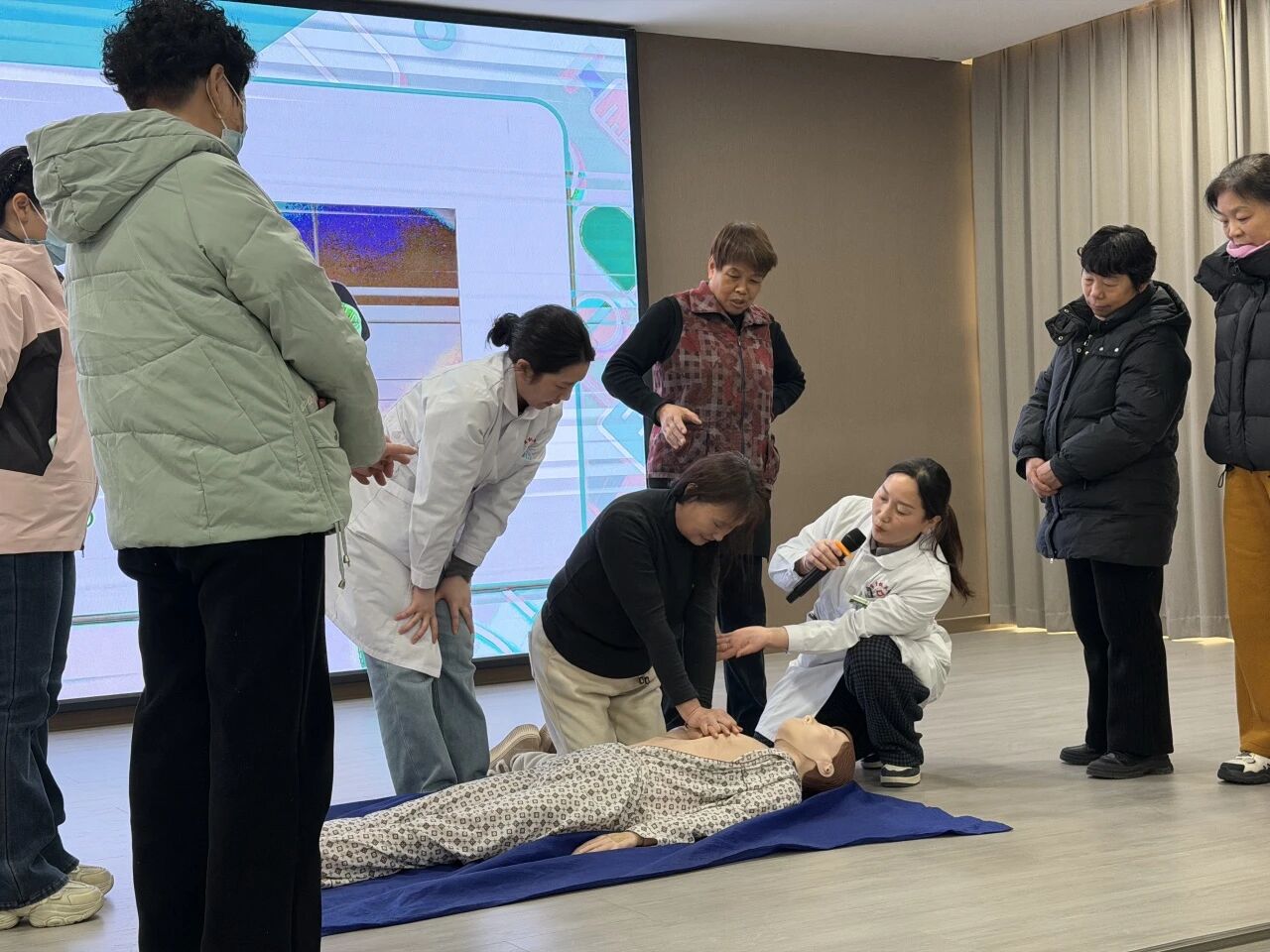 实操互动环节将活动推向高潮。现场进行模拟演练,家长们踊跃上台,在医护人员的手把手指导下,使用急救模拟人进行实操练习。“手臂伸直,用上半身力量垂直按压”“按压深度成人5-6厘米,儿童约5厘米”“海姆立克法要注意避开肋骨位置”,医护人员逐一对家长的操作姿势、力度、节奏进行纠正,确保每个动作都规范到位。有家长在反复练习中逐渐找到手感,从最初的紧张生疏到后来的熟练流畅,不少人感慨:“以前只在电视上见过,今天亲手操作才知道,正确的急救动作原来这么有讲究!”