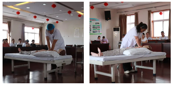 技能比武环节设置单人徒手心肺复苏术和双人简易呼吸器心肺复苏术两个项目,分为专业组和非专业组共14组选手。