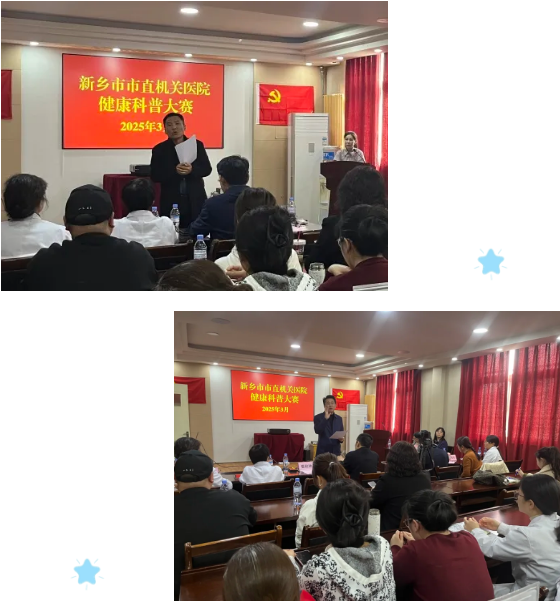 为深入贯彻落实健康中国战略,激发医务人员的科普热情和创新能力,更好地选拔推荐科普人才,2025年3月28日下午新乡市市直机关医院在四楼教室举办了一场别开生面的健康科普大赛选拔赛。比赛邀请了河南省科普专家娄政驰、周志强,及我院杜永芳书记、吴晶莹副院长、医务科主任、护理部主任担任评委。